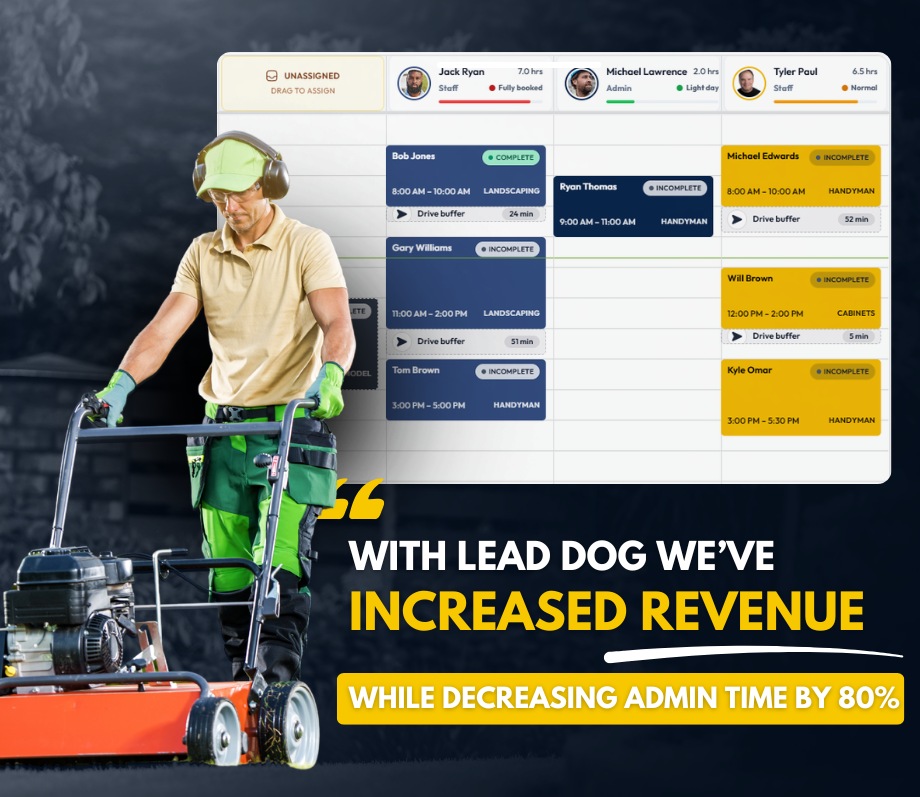 Lead Dog replaces whiteboards, notebooks, spreadsheets, and scattered text messages with one simple system built for lawn care companies. Schedule jobs, manage crews, send estimates, invoice customers, and track your business in real time.